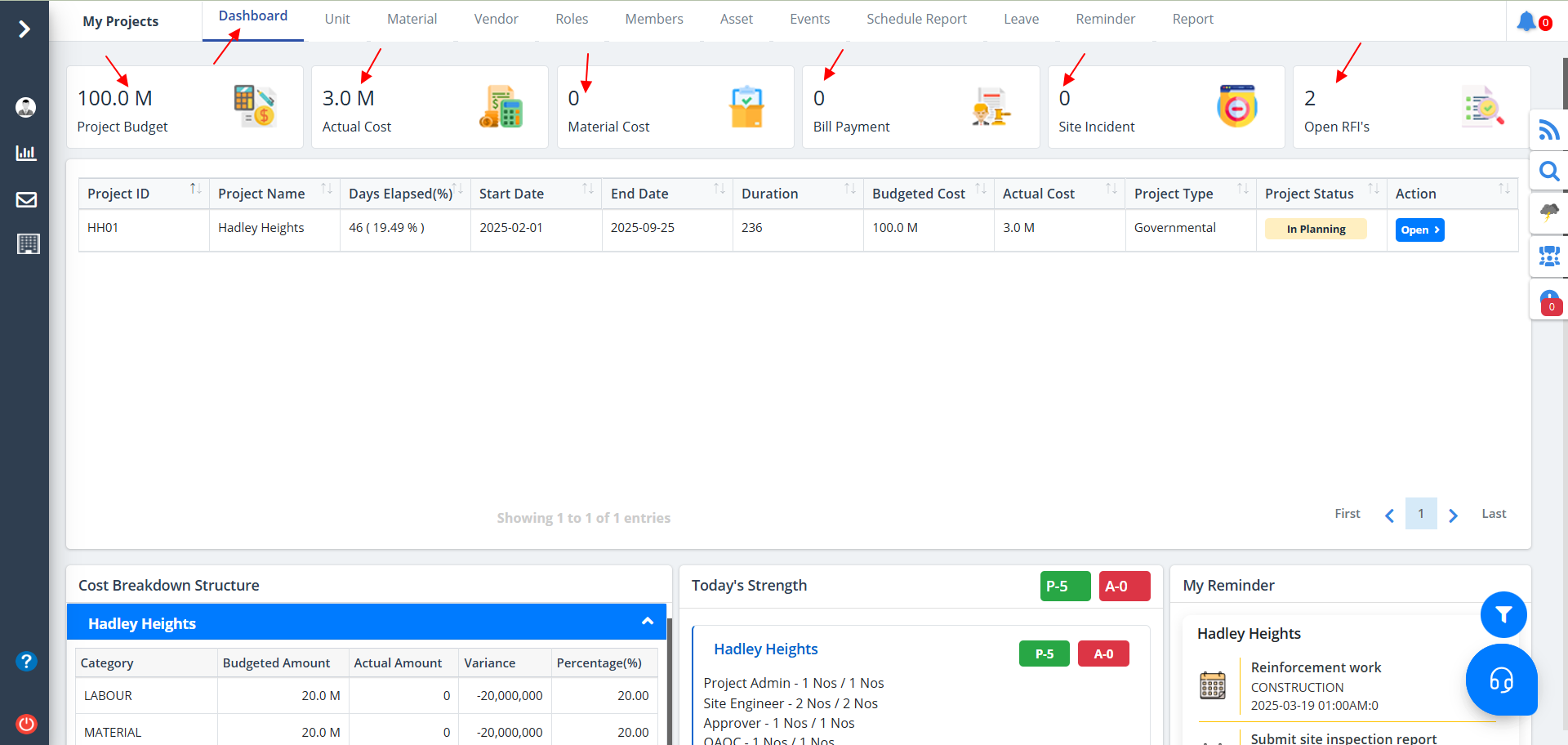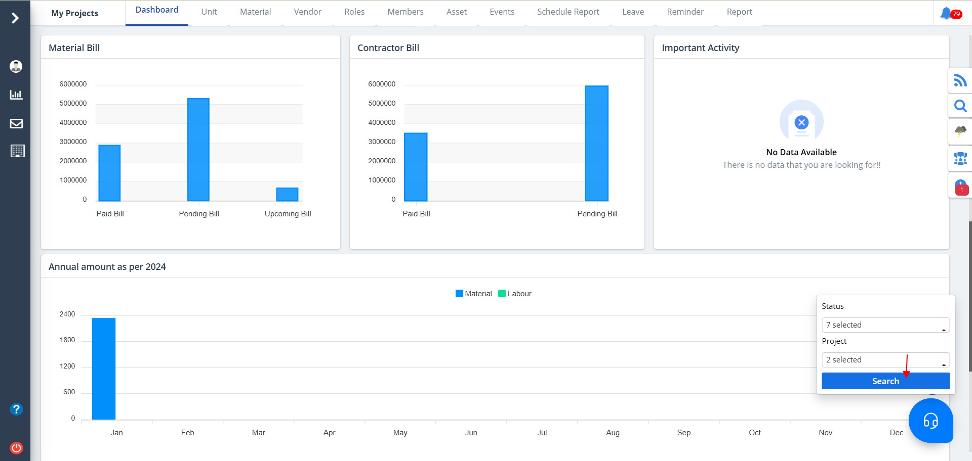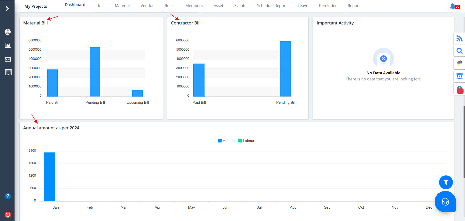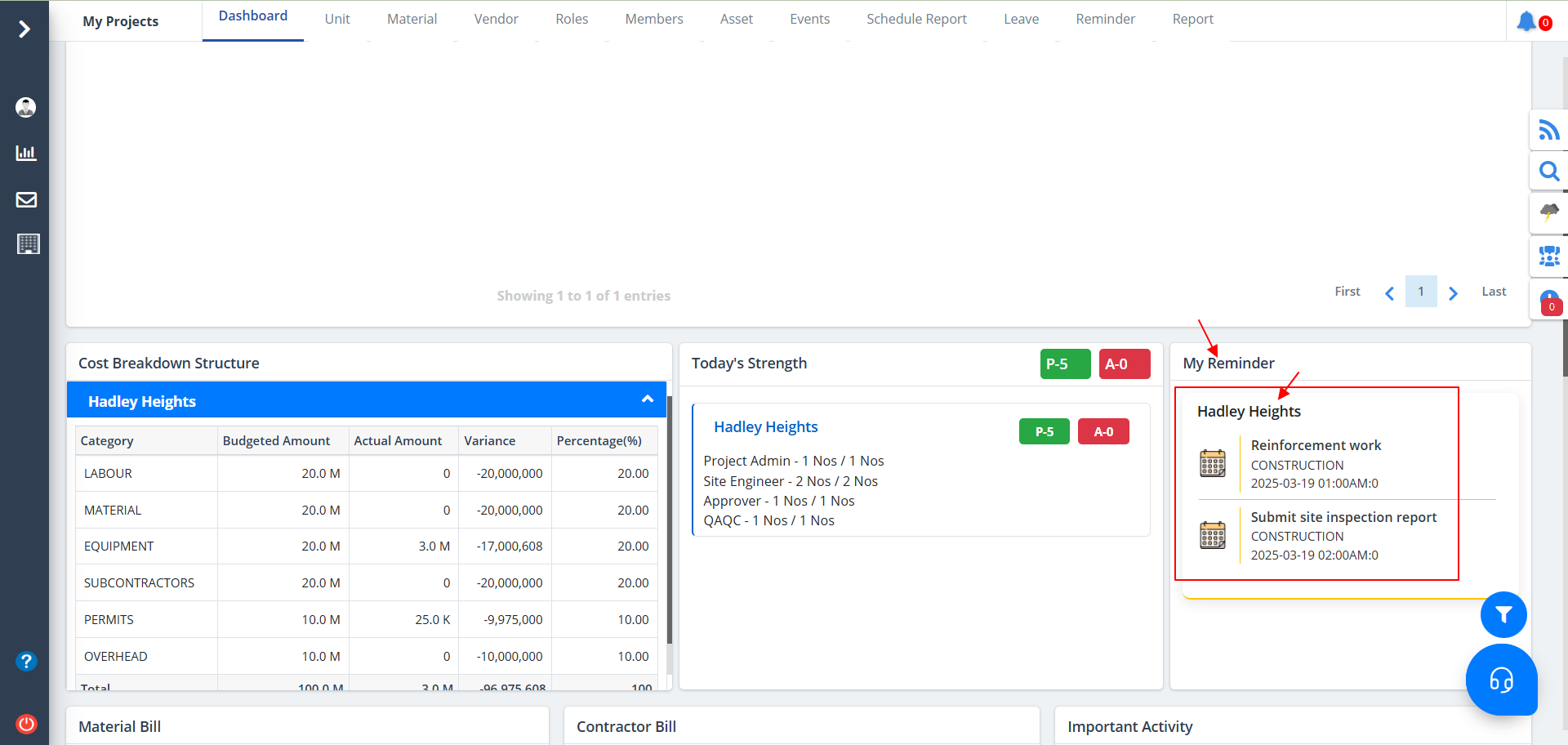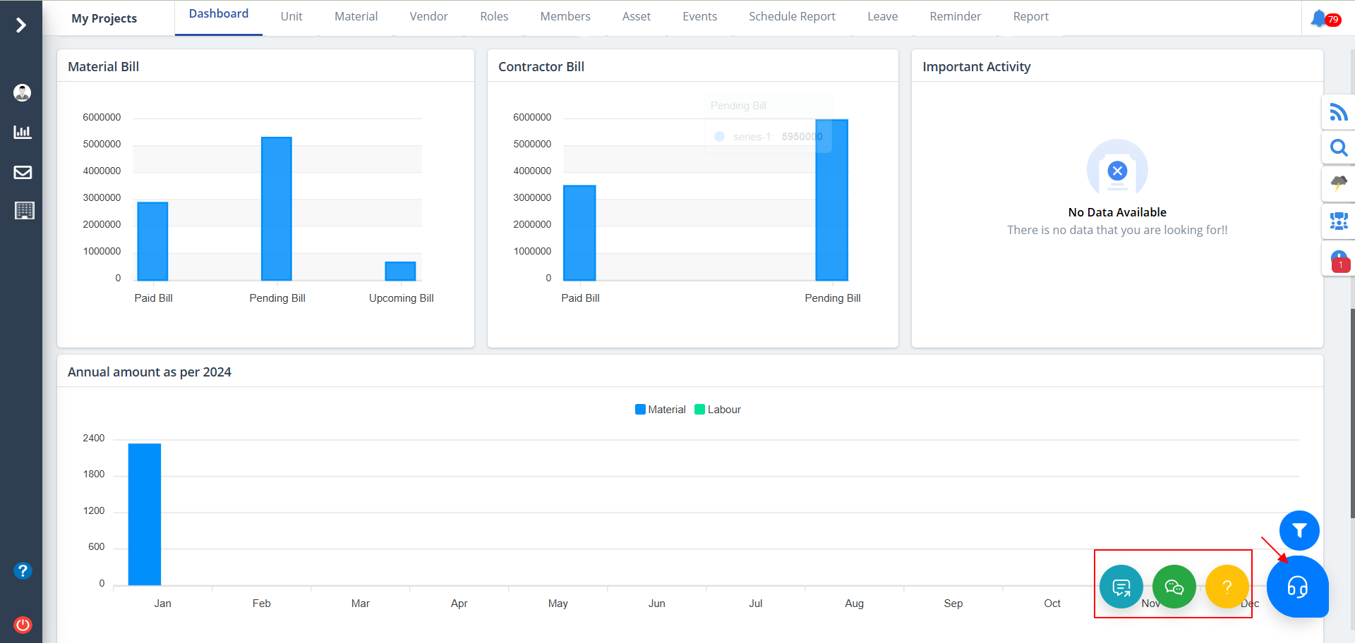 - Pending Bill: Outstanding contractor payments.