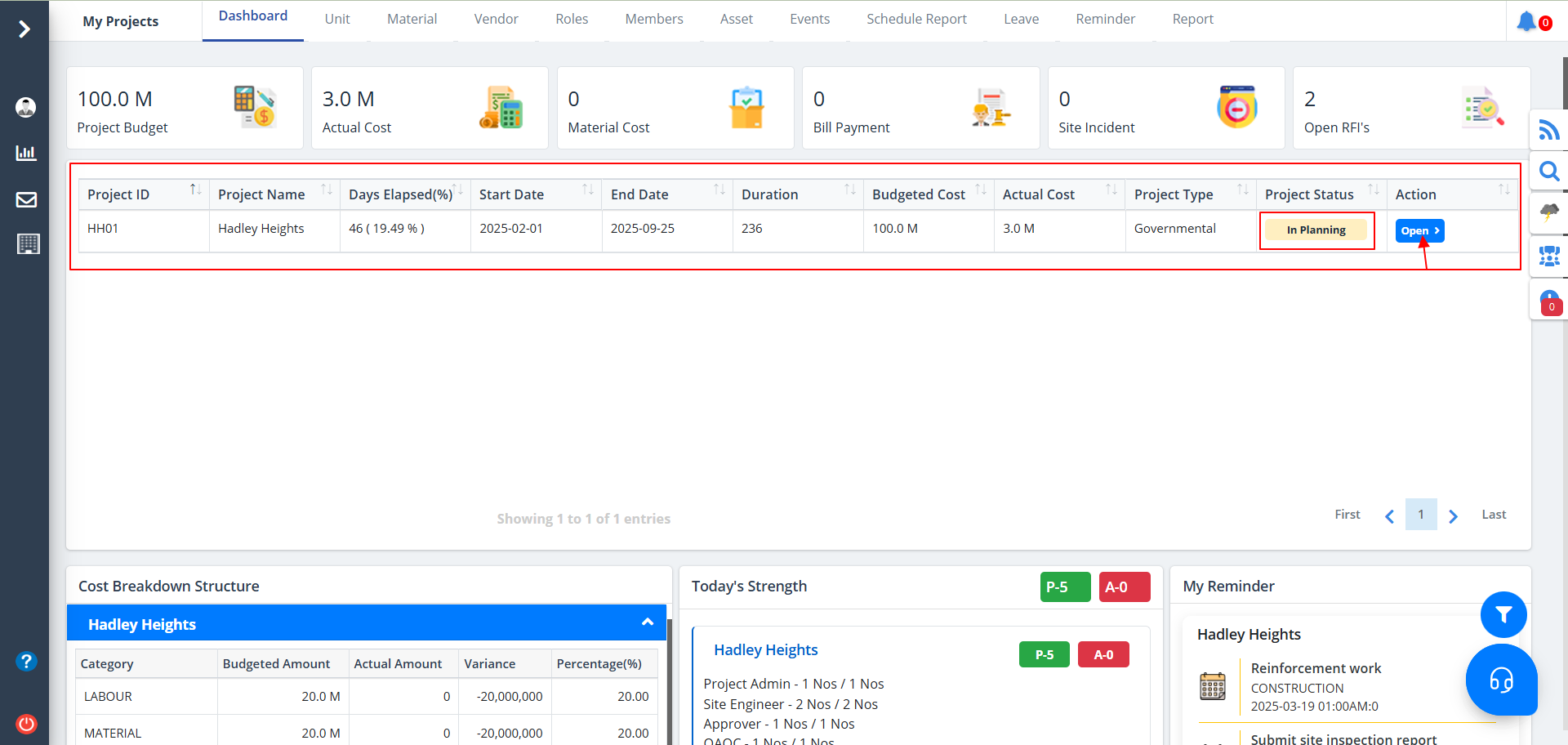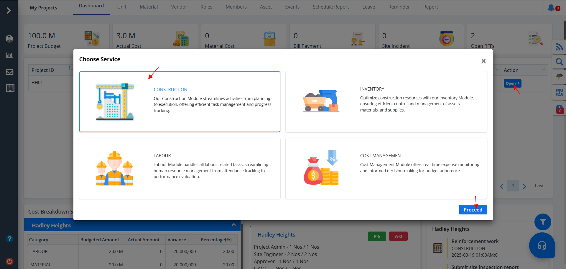 - Use the button under Action column to switch between services such as Construction, Inventory, Labour & Cost Management.