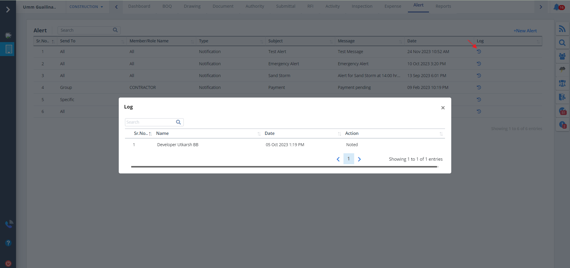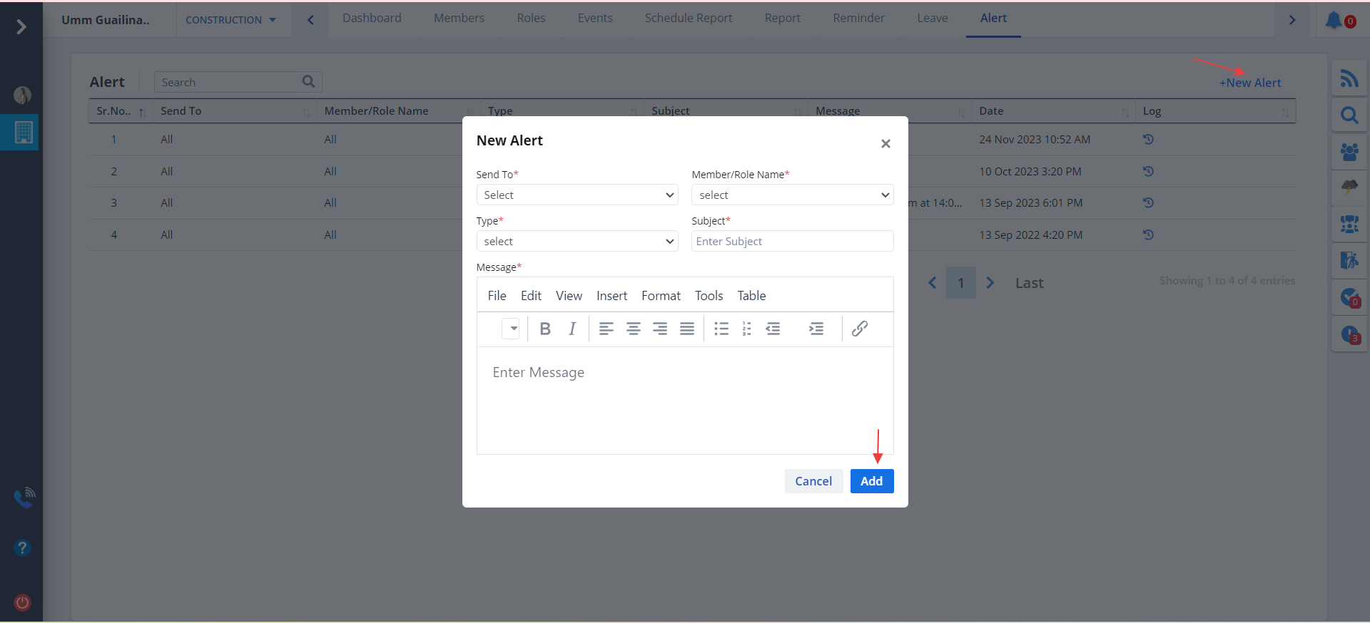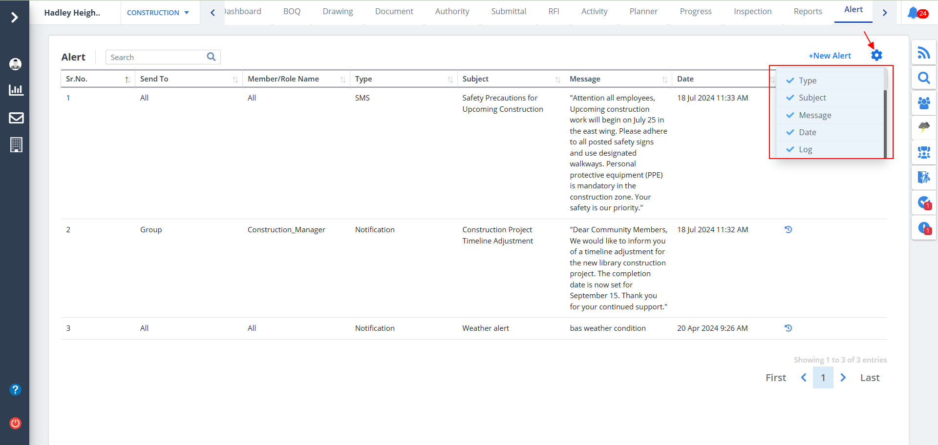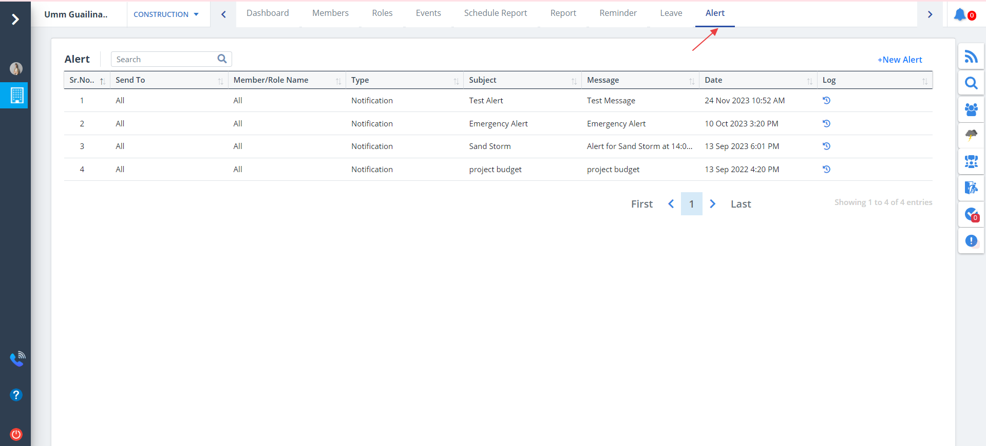 - Click on New Alert to generate a whole new alert message and send it to a single user, multiple users on group basis (such as developer, consultant, contractor, subcontractor and project admin) or all users.