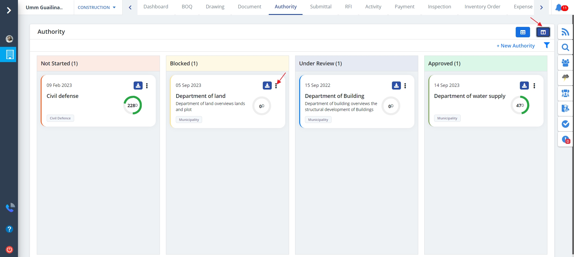 - Kanban View is as shown below. Below figure shows the authorities based on approval status; Pending, Under Review or Approved.
