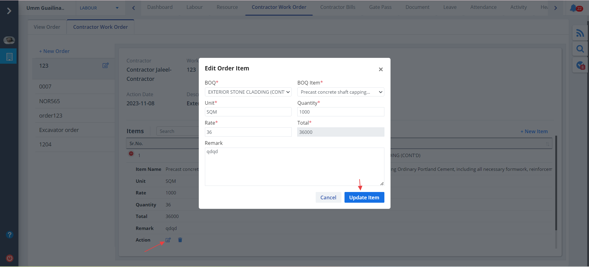 - Use the Action column to edit the order item.