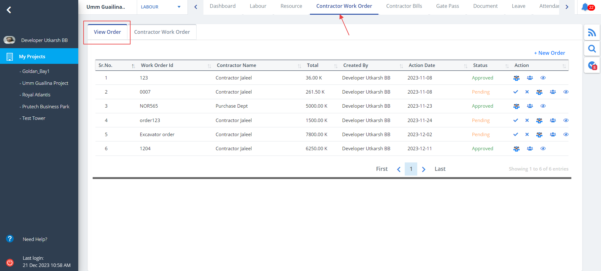 - Click on Contractor Work Order as shown. 2tabs are visible namely; View Order and Contractor Work Order.