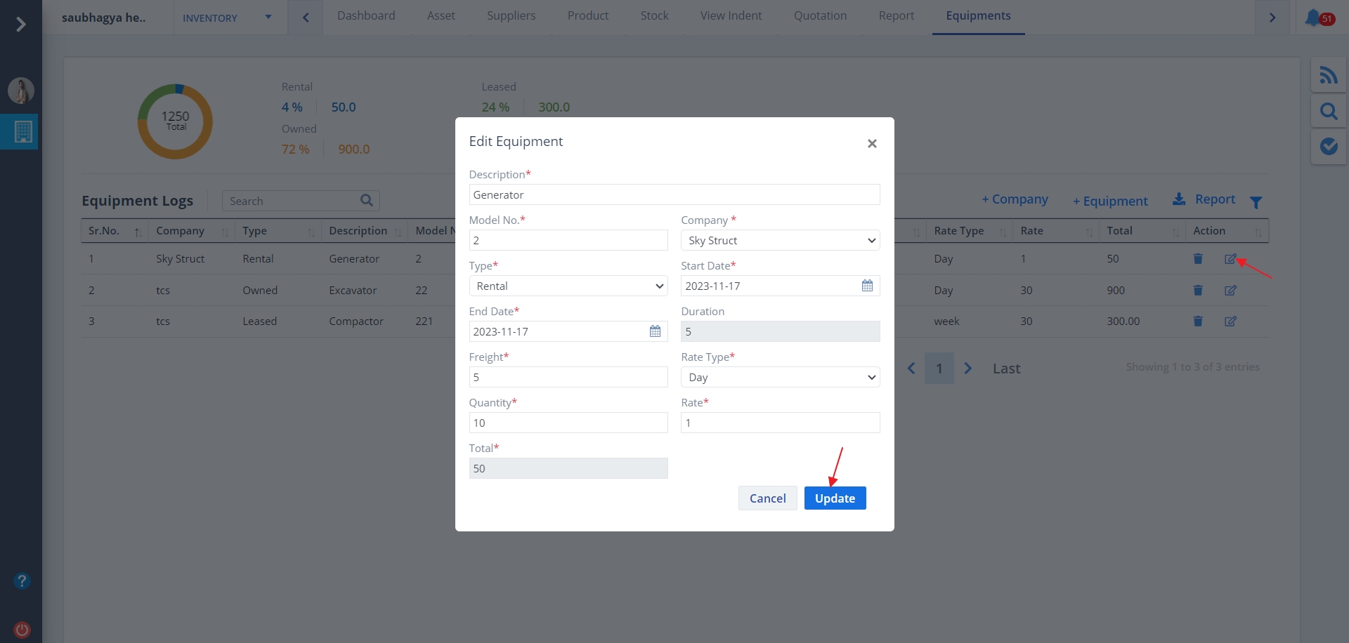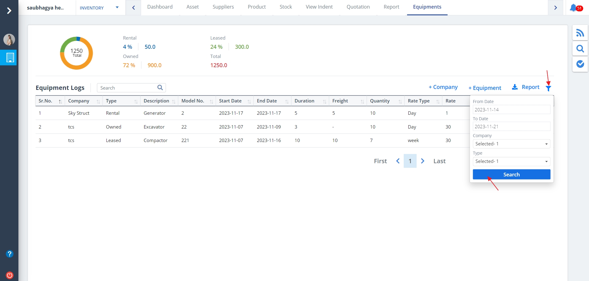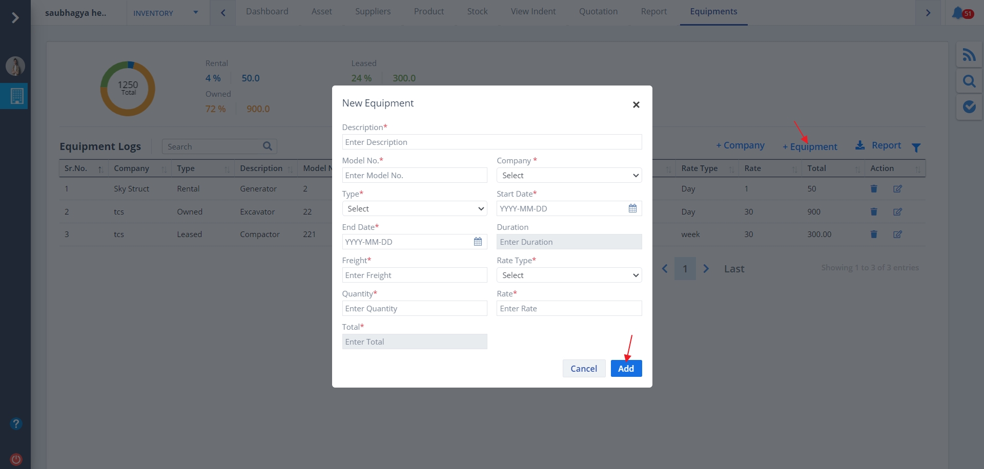 - Click on +Equipment to add a new log.