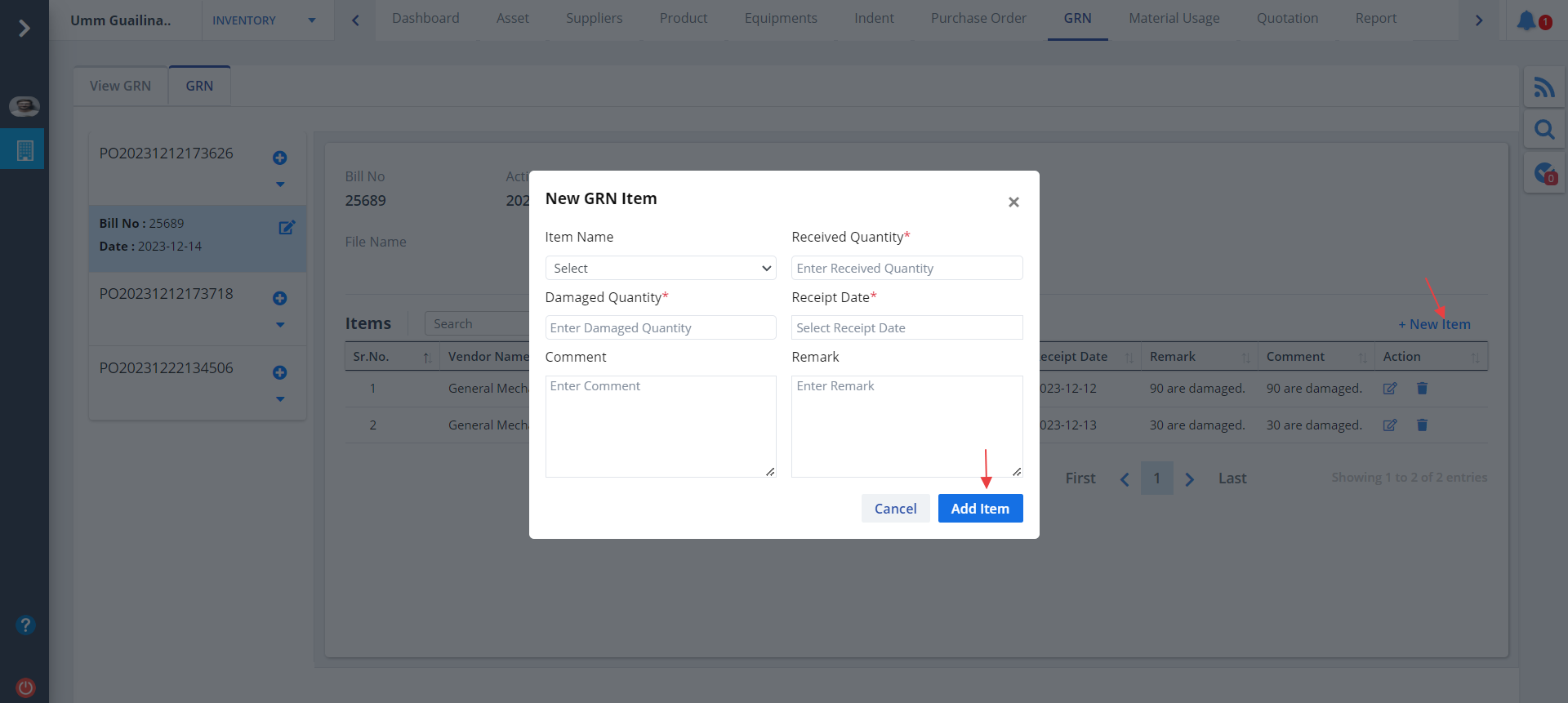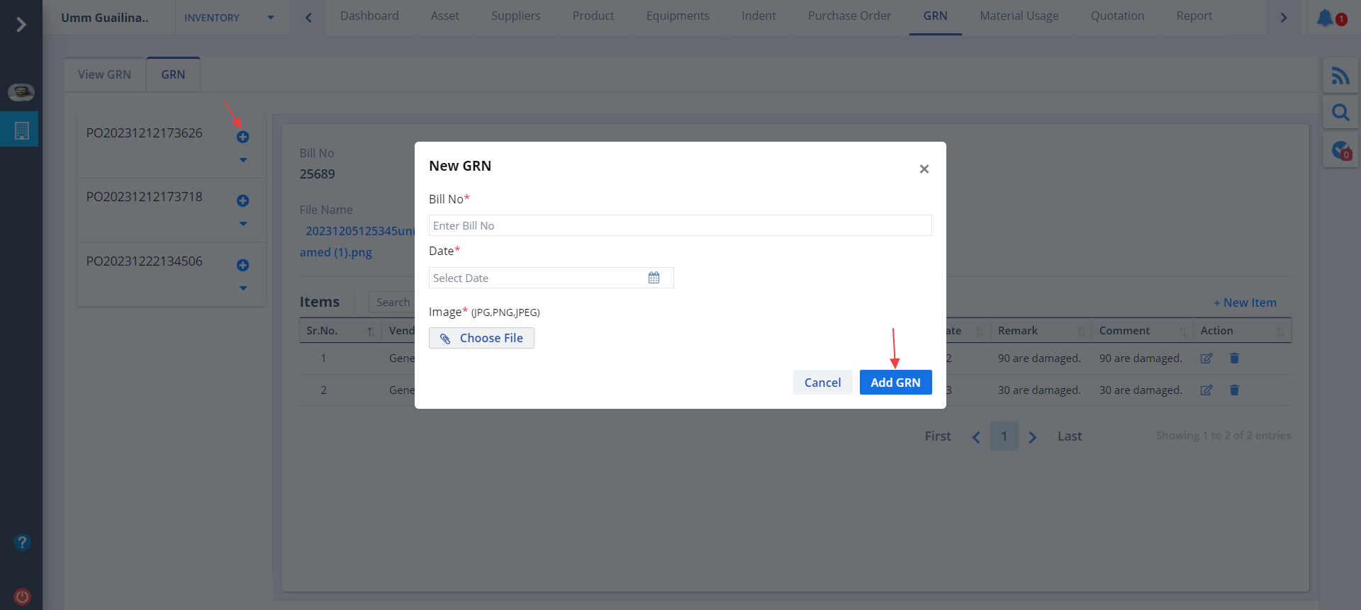 - Specify details and click on Add GRN button.