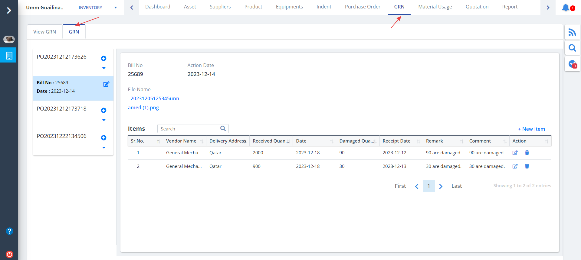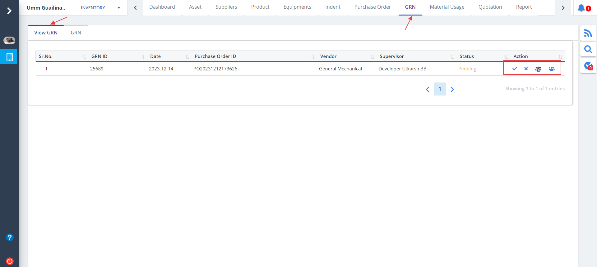 - All the details regarding Goods Received Note will be displayed along with the purchase order, vendor and supervisor details.