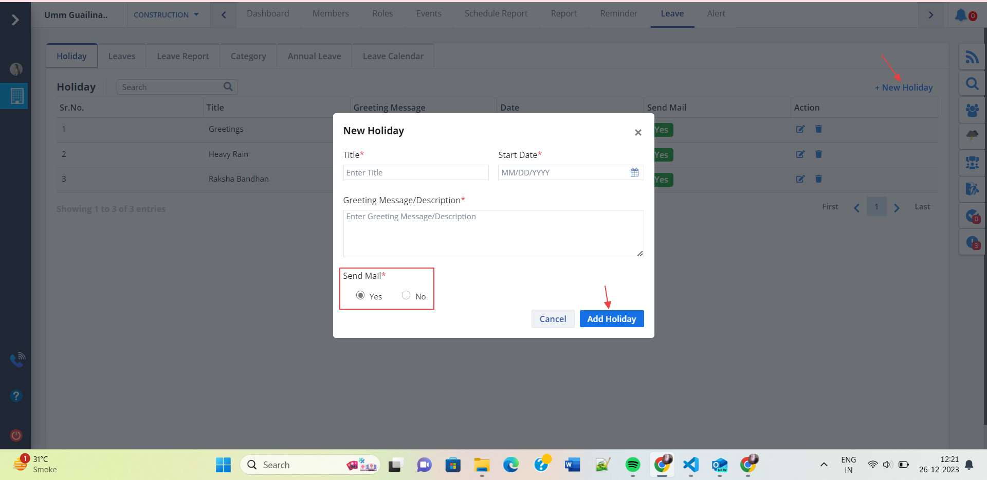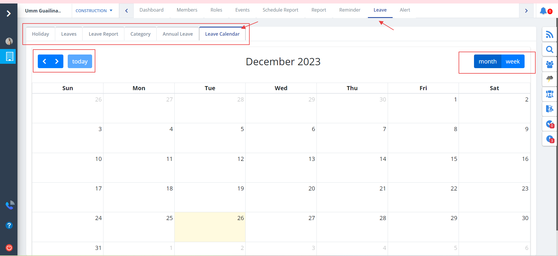 - Actual calendar will be shown which will include the holidays too which the user had added. The curent date will be highlighted.