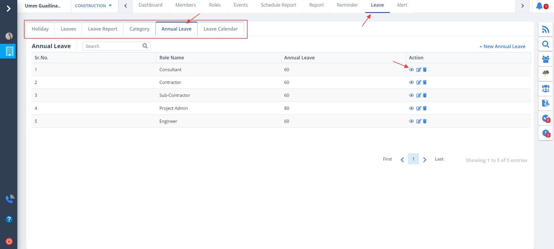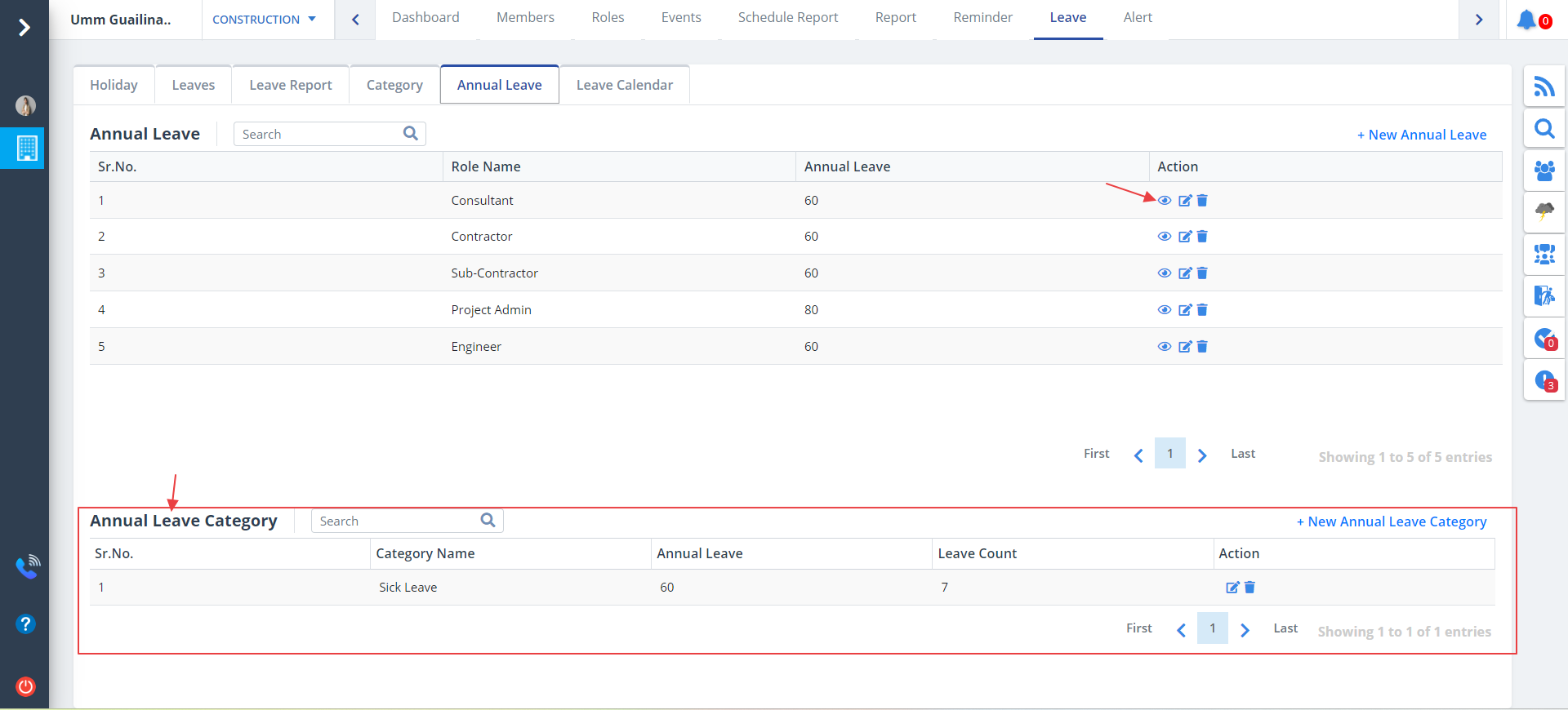 - Click on the Eye button under Action column as shown to view the annual leave category details if already mentioned.