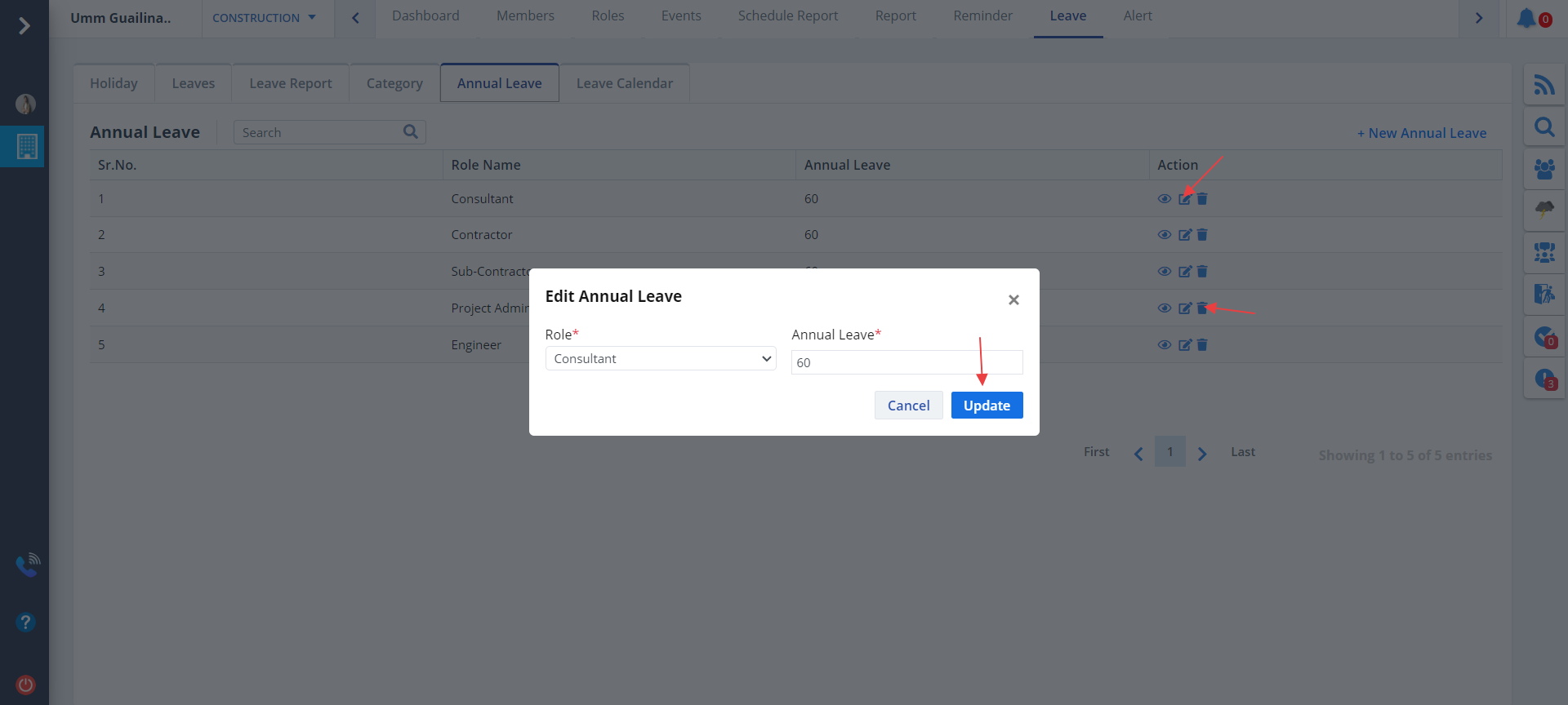 - Similarly you can edit a particular leave category by clicking on the Edit button as shown. Modify required details andd click on Edit Annual Leave.