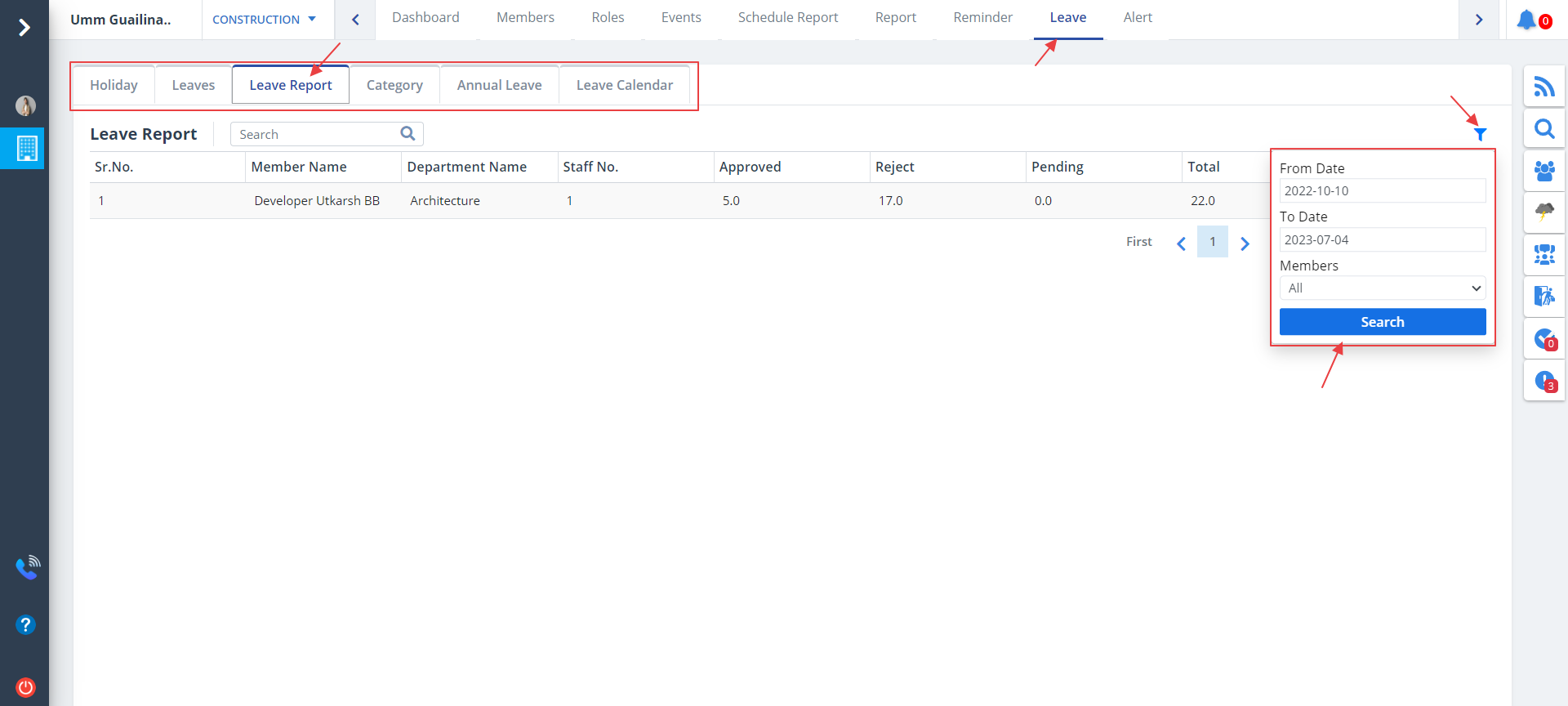 - Use the Filter button as shown to narrow the data visibility. Just select dates and members. Now click on Search.