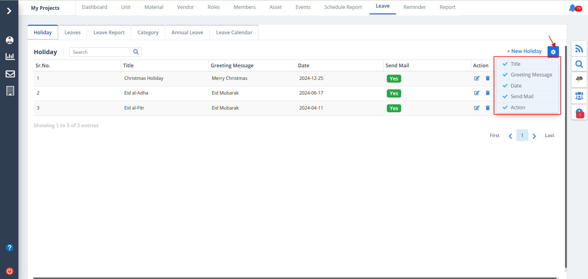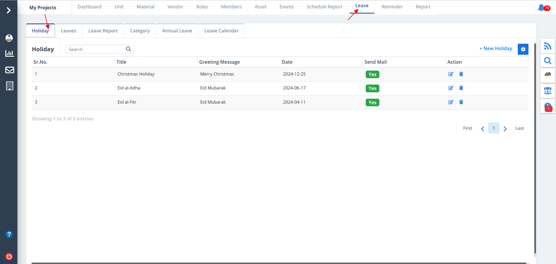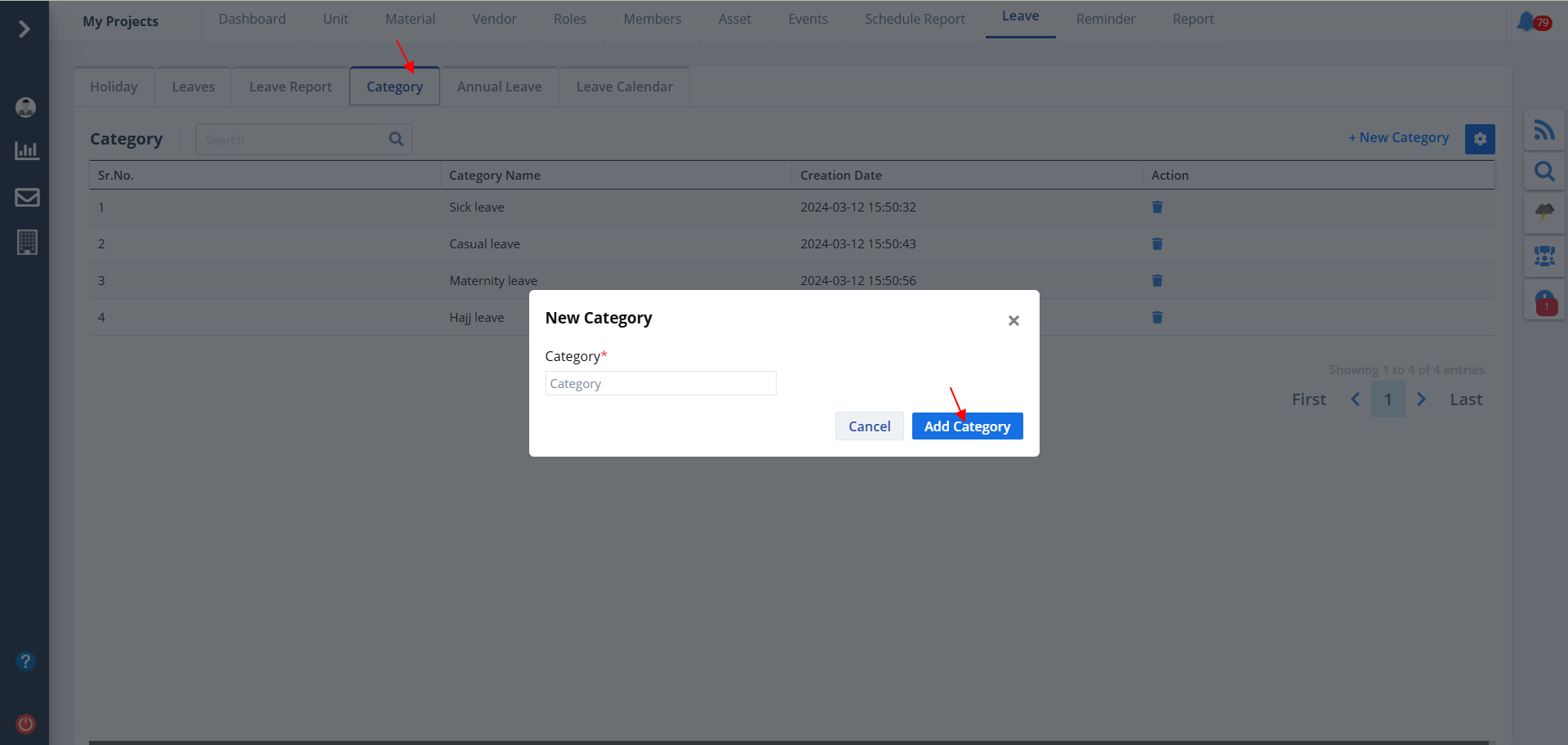 - This module is divided into 6 categories; Holiday, Leaves, Leave Report, Category, Annual Leave and Leave Calendar